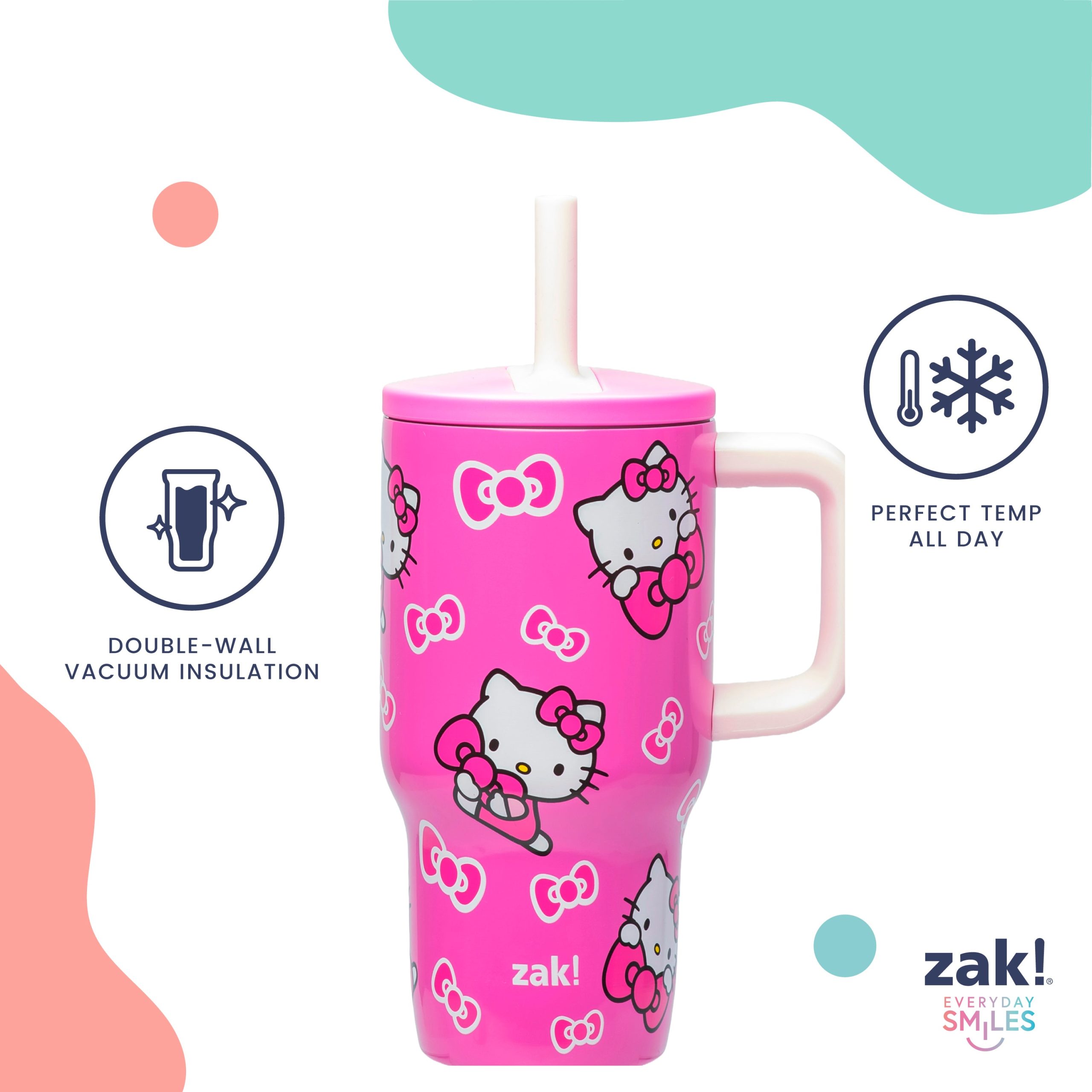 The 16-ounce Hello Kitty tumbler is made of durable stainless steel. with vacuum insulation that keeps drinks fresh and cool while stopping condensation and water rings. It has a silicone straw that’s comfortable to sip from. as well as sealed to the lid to help prevent splashes and spills. When you’re on the go. the handle gives you a secure grip and the tumbler fits in most car cup holders. making travel easy and convenient. And at the end of the day. the durable stainless steel straw tumbler is top rack dishwasher safe for easy cleanup! Use it with kids age 3 and up for cold drinks only. and do not microwave.