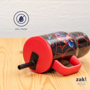 The 16-ounce Spider-Man tumbler is made of durable stainless steel. with vacuum insulation that keeps drinks fresh and cool while stopping condensation and water rings. It has a silicone straw that’s comfortable to sip from. as well as sealed to the lid to help prevent splashes and spills. When you’re on the go. the handle gives you a secure grip and the tumbler fits in most car cup holders. making travel easy and convenient. And at the end of the day. the durable stainless steel straw tumbler is top rack dishwasher safe for easy cleanup! Use it with kids age 3 and up for cold drinks only. and do not microwave.