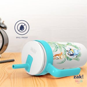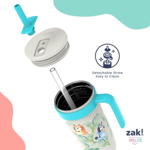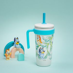 The 18-ounce Bluey tumbler is made of durable stainless steel. with vacuum insulation that keeps drinks fresh and cool while stopping condensation and water rings. It has a silicone straw that’s comfortable to sip from. as well as sealed to the lid to help prevent splashes and spills. When you’re on the go. the handle gives you a secure grip and the tumbler fits in most car cup holders. making travel easy and convenient. And at the end of the day. the durable stainless steel straw tumbler is top rack dishwasher safe for easy cleanup! Use it with cold drinks only and do not microwave.