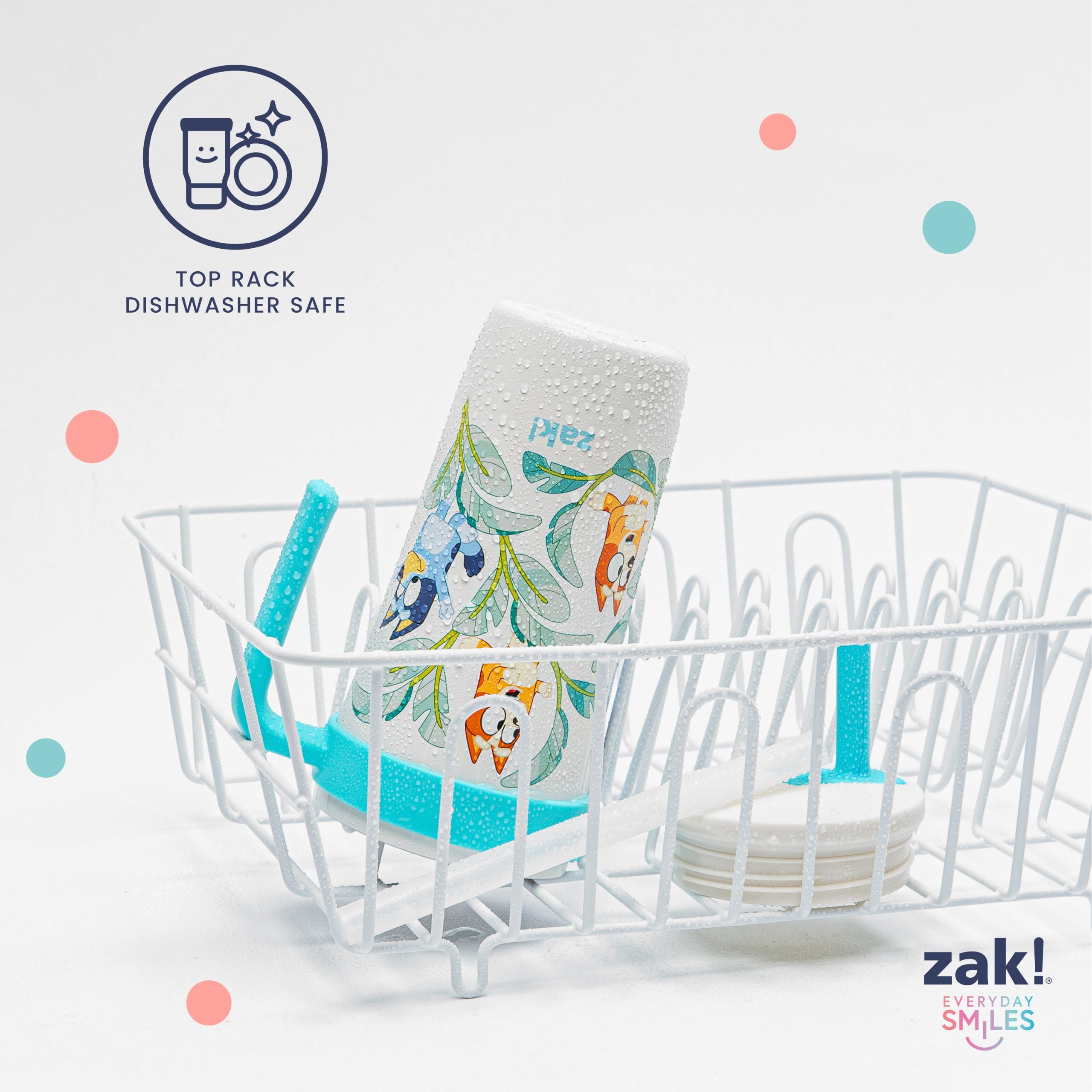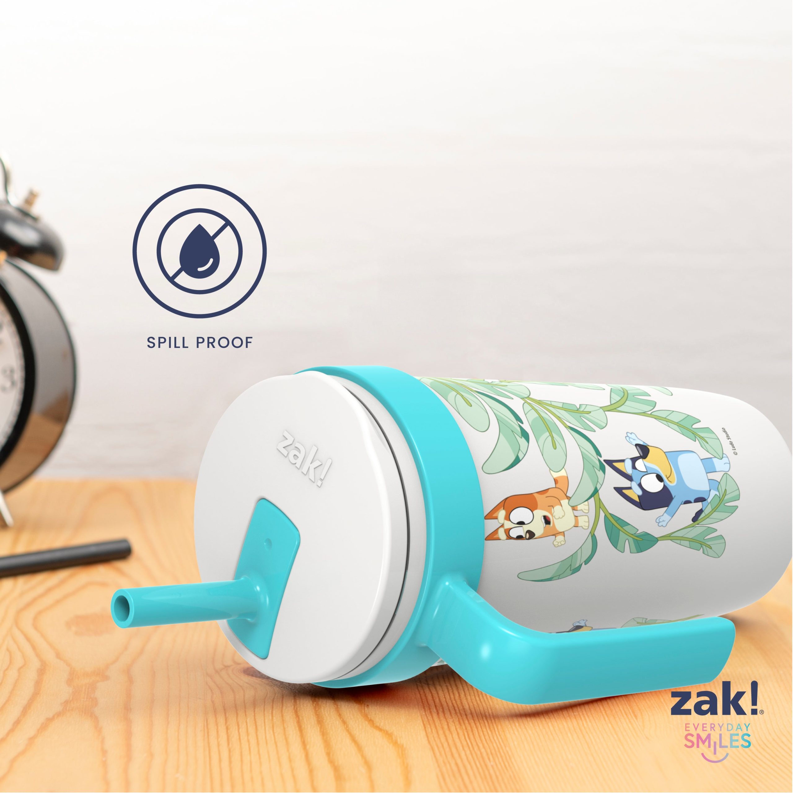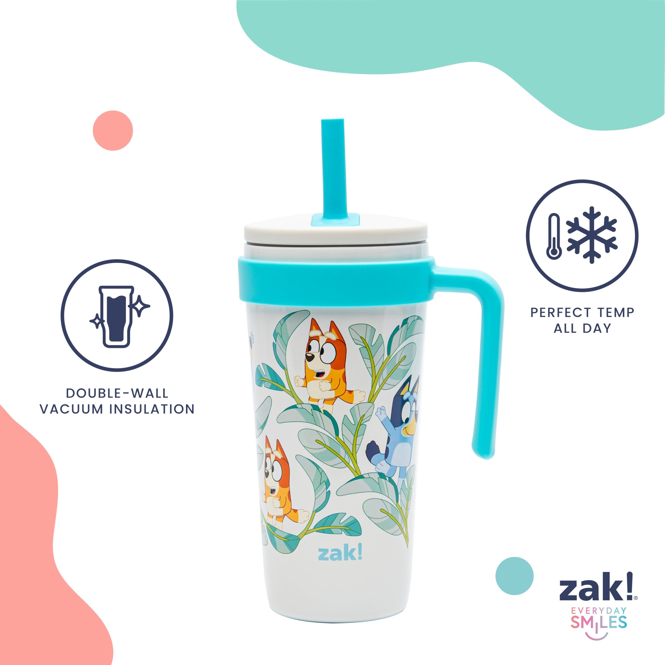The 18-ounce Bluey tumbler is made of durable stainless steel. with vacuum insulation that keeps drinks fresh and cool while stopping condensation and water rings. It has a silicone straw that’s comfortable to sip from. as well as sealed to the lid to help prevent splashes and spills. When you’re on the go. the handle gives you a secure grip and the tumbler fits in most car cup holders. making travel easy and convenient. And at the end of the day. the durable stainless steel straw tumbler is top rack dishwasher safe for easy cleanup! Use it with cold drinks only and do not microwave.