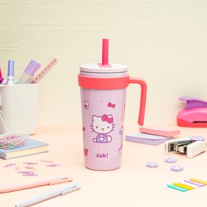 The 18-ounce Hello Kitty tumbler is made of durable stainless steel. with vacuum insulation that keeps drinks fresh and cool while stopping condensation and water rings. It has a silicone straw that’s comfortable to sip from. as well as sealed to the lid to help prevent splashes and spills. When you’re on the go. the handle gives you a secure grip and the tumbler fits in most car cup holders. making travel easy and convenient. And at the end of the day. the durable stainless steel straw tumbler is top rack dishwasher safe for easy cleanup! Use it with cold drinks only and do not microwave.