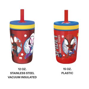 Let’s keep it simple: these Marvel Spidey tumblers don’t leak. The silicone sipper spout design has a built-in valve that stops water from flowing when no one is drinking: it’s easy for children to quench their thirst. but won’t make a mess if the tumbler is tipped over. It’s the perfect choice for active kids. or young ones just graduating from sippy cups who aren’t ready for an open-topped tumbler yet. Two tumblers and a bonus sipper are included in the set—the 12-ounce stainless steel tumbler has vacuum insulation. which keeps drinks cold and eliminates water rings from condensation. and the 15-ounce plastic tumbler is lightweight and easy to carry. They’re both durable. reusable. and completely BPA free.