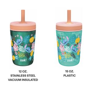 Let’s keep it simple: these Lilo & Stitch tumblers don’t leak. The silicone sipper spout design has a built-in valve that stops water from flowing when no one is drinking: it’s easy for children to quench their thirst. but won’t make a mess if the tumbler is tipped over. It’s the perfect choice for active kids. or young ones just graduating from sippy cups who aren’t ready for an open-topped tumbler yet. Two tumblers and a bonus sipper are included in the set??the 12-ounce stainless steel tumbler has vacuum insulation. which keeps drinks cold and eliminates water rings from condensation. and the 15-ounce plastic tumbler is lightweight and easy to carry. They’re both durable. reusable. and completely BPA free.